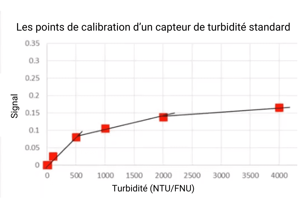 Pour illustrer, considérons un capteur typique dont le signal ne suit pas une augmentation linéaire avec la concentration en particules. Aux faibles niveaux de turbidité, le capteur peut sembler fonctionner correctement. Cependant, à mesure que la turbidité augmente, le signal ne suit pas le rythme – il s’aplatit ou même diminue, indiquant de manière incorrecte que la turbidité est moins élevée qu’elle ne l’est en réalité.