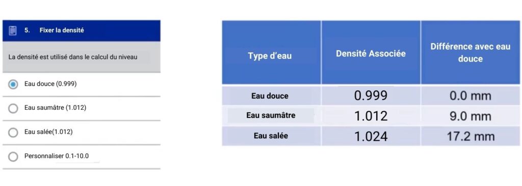 Dans de nombreux cas, l’utilisateur peut spécifier la densité de l’eau mesurée. Cela permet d’affiner les mesures en tenant compte des caractéristiques spécifiques du fluide. Cependant, si la gravité spécifique de l’eau est incorrectement supposée, cela peut conduire à des différences significatives dans la mesure du niveau d’eau. Par exemple, si l’eau douce est supposée pour une application en eau salée, la mesure du niveau d’eau pourrait être erronée de 17 millimètres.