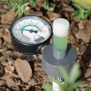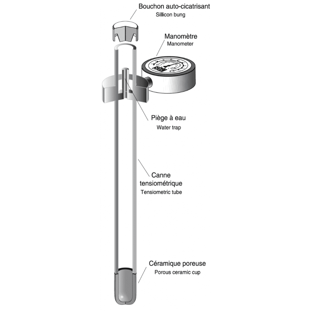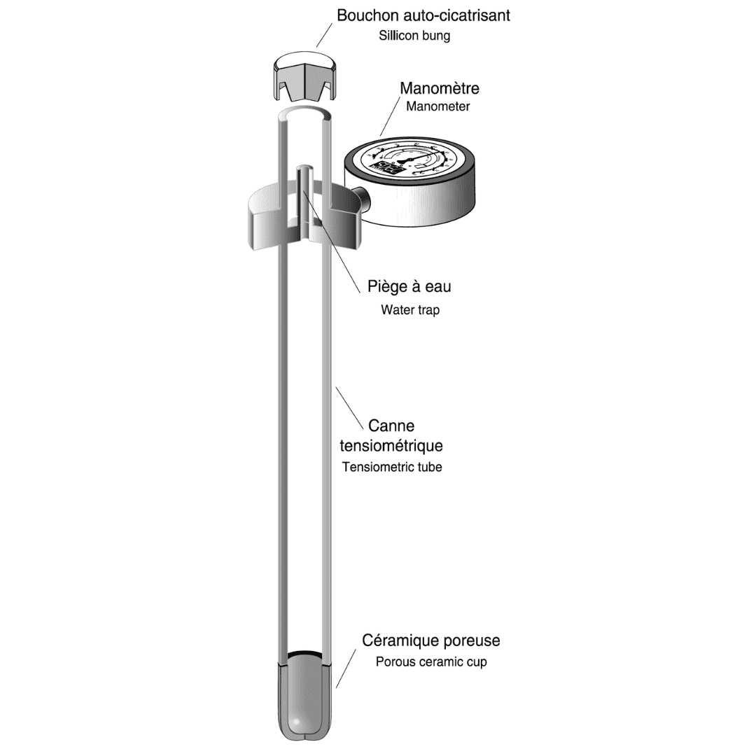 Ces sondes sont constituées d’un tube avec un embout poreux inséré dans le sol. Le tube, rempli d’eau, est soumis à un vide d’air à son sommet. Lorsque le sol entourant la pointe se dessèche, la tension dans le tube augmente, indiquant ainsi une baisse de la teneur en eau. Les sondes tensiométriques, fournissent des informations détaillées sur l’humidité du sol, allant d’une saturation totale (0 cbars) à environ 85 cbars.