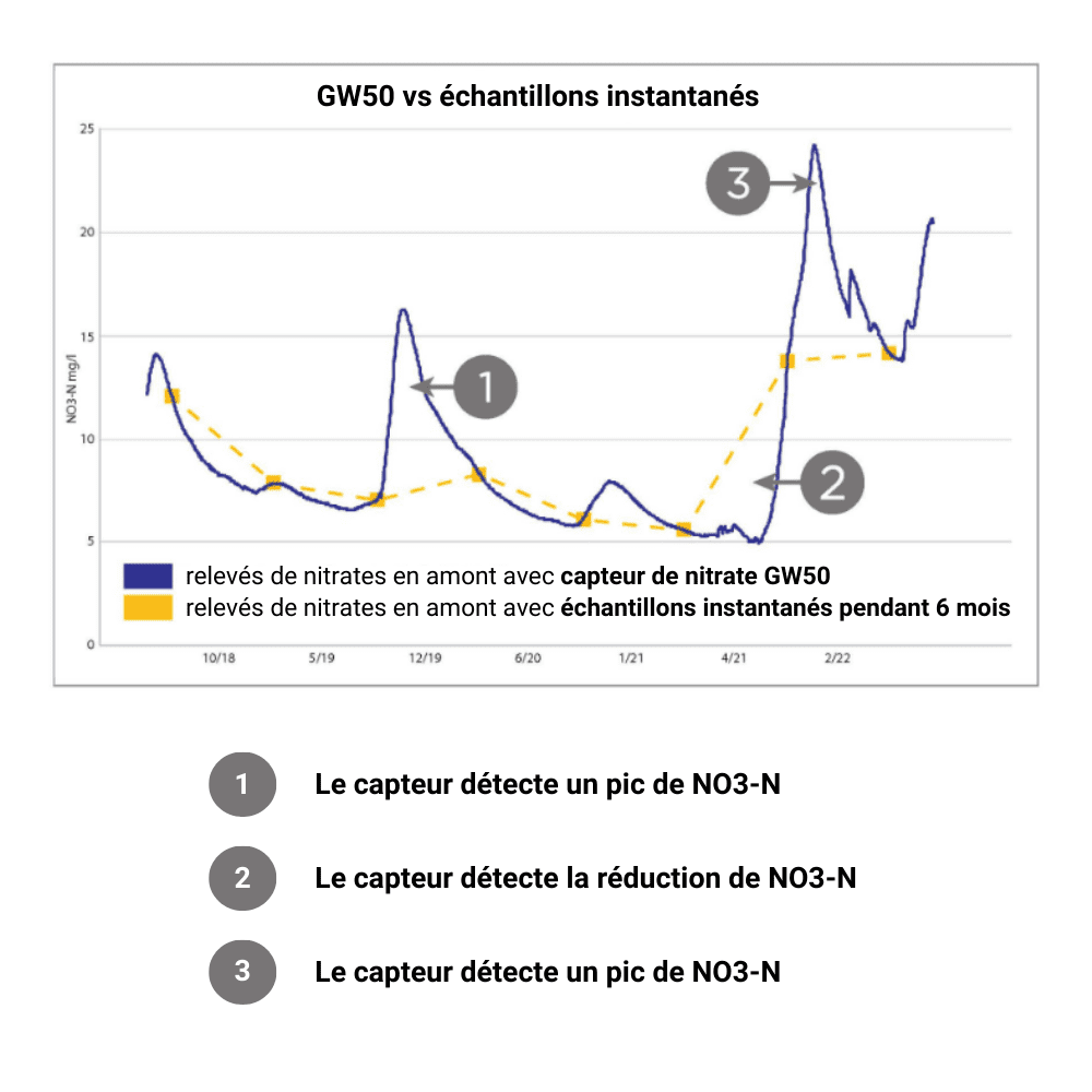 ✔ Capture des événements ponctuels : Les capteurs détectent immédiatement les hausses de nitrates après une pluie ou un épandage.