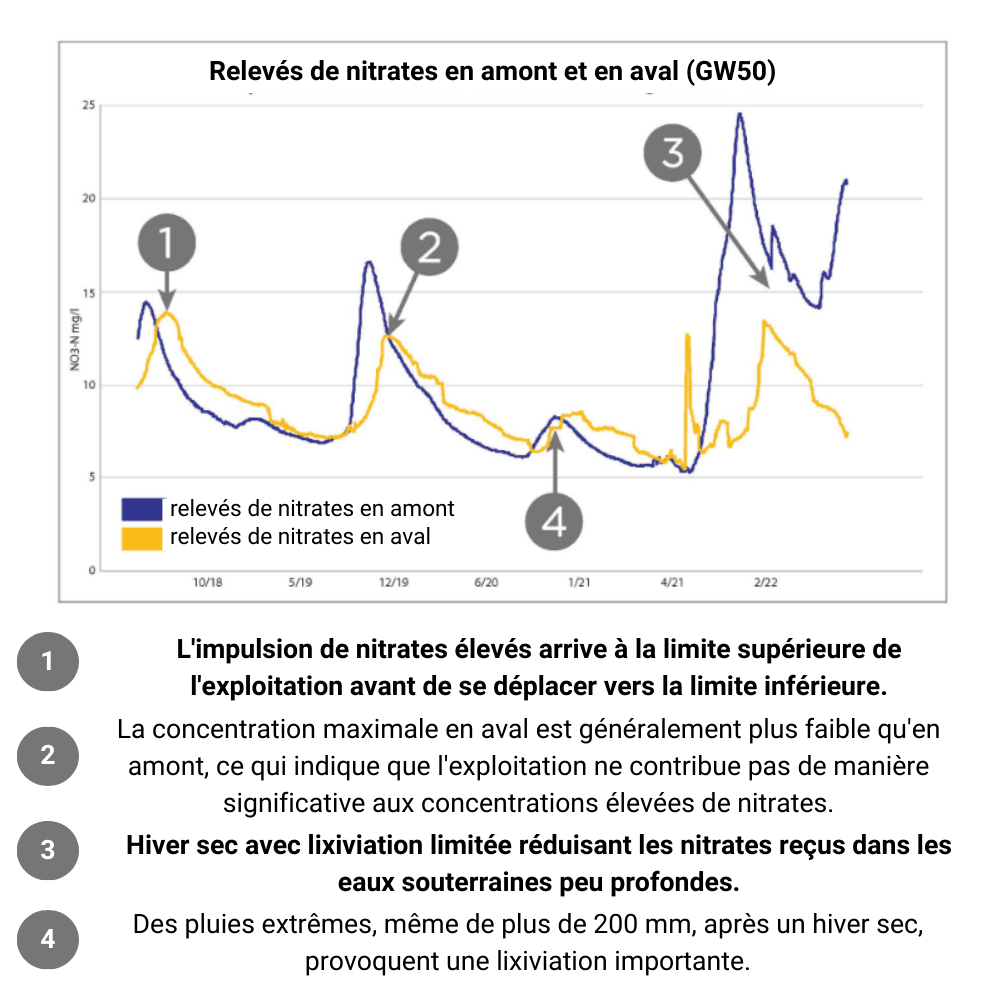 - Une augmentation progressive des nitrates dans le puits, suggérant une accumulation dans la nappe phréatique à long terme.