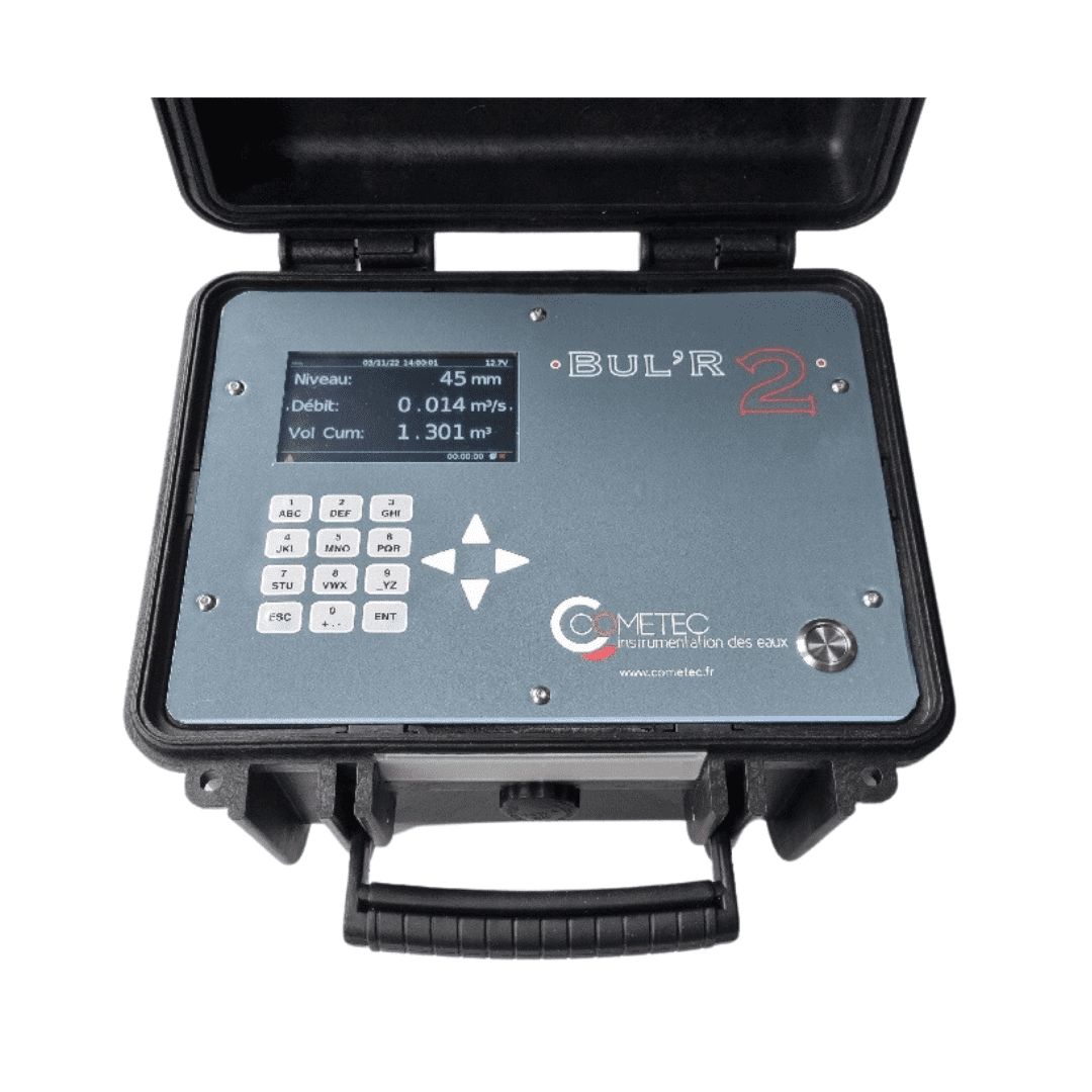 Le Bul’R2 est un débitmètre portable fonctionnant sur le principe de la mesure bulle à bulle, adapté aux canaux équipés d’organes déprimogènes comme les déversoirs et canaux venturi. Offrant une mesure de niveau précise, cet appareil robuste se présente dans une valise résistante avec un générateur d’air intégré.