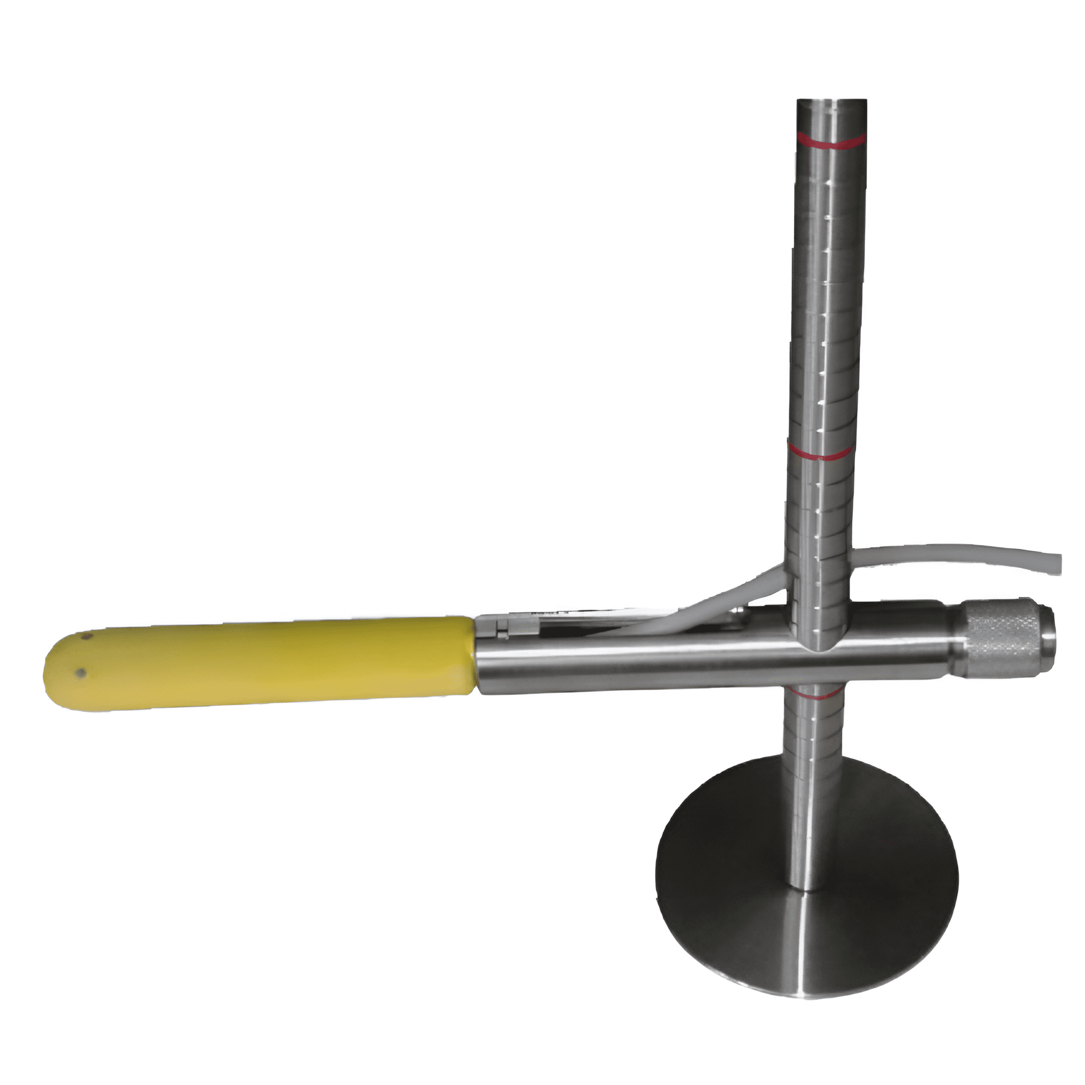 Composée de sections cylindriques de 500 mm de longueur, cette perche est équipée d’un plateau à sa base, d’une poignée et d’un coulisseau pour attacher la sonde du courantomètre.