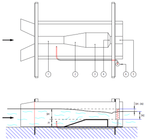 4. La section étroite se déverse dans une sortie divergente où le débit est réduit à sa valeur initiale. Le canal d’Eijkelkamp présente une transition brutale : la section divergente a une longueur de 0 cm.