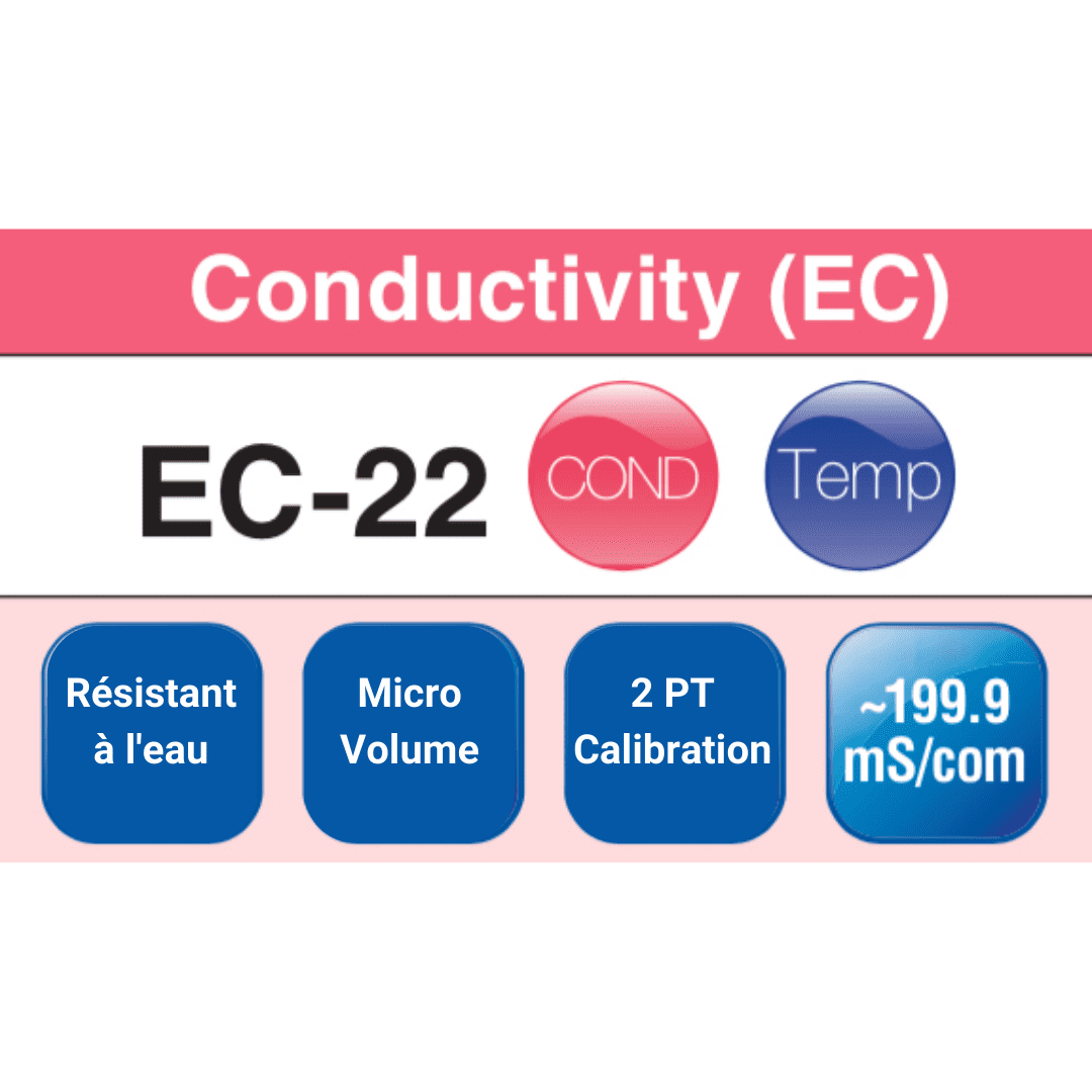 Idéal pour les professionnels en science et qualité de l’eau, les modèles EC-11, EC-22, et EC-33 simplifient la calibration et la mesure. Il suffit de déposer quelques gouttes sur le capteur pour des résultats rapides et fiables, économisant temps et échantillons.