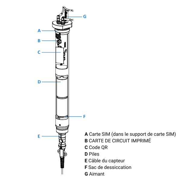 Le modem a besoin de piles pour fonctionner. Si vous connectez un capteur au port 2 (capuchon supérieur), il se peut que vous deviez fournir une alimentation externe en fonction du type de capteur. Il est possible de connecter une batterie externe plus importante ou une alimentation externe pour répondre à ce besoin.