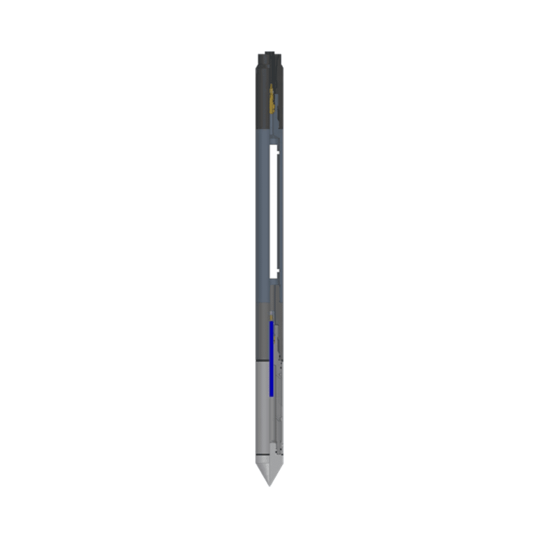 Le module Géomagnétique peut être logé derrière une pointe factice ou derrière un cône CPT de 15 cm² en acier non magnétique de haute qualité. Il se compose d’un boîtier non magnétique et possède un filetage conique standard en haut pour la connexion à la chaîne de tubes de sondage CPT. Un repère « Nord » se trouve sur l’extérieur du boîtier (axe Y). Le capteur à effet Hall en direction XYZ permet de déterminer la position et l’orientation d’un objet. Un inclinomètre bidirectionnel intégré aligné avec les capteurs XY avec une plage de mesure de +/-25° (précision supérieure à 0,1°) permet de déterminer l’orientation du champ magnétique.