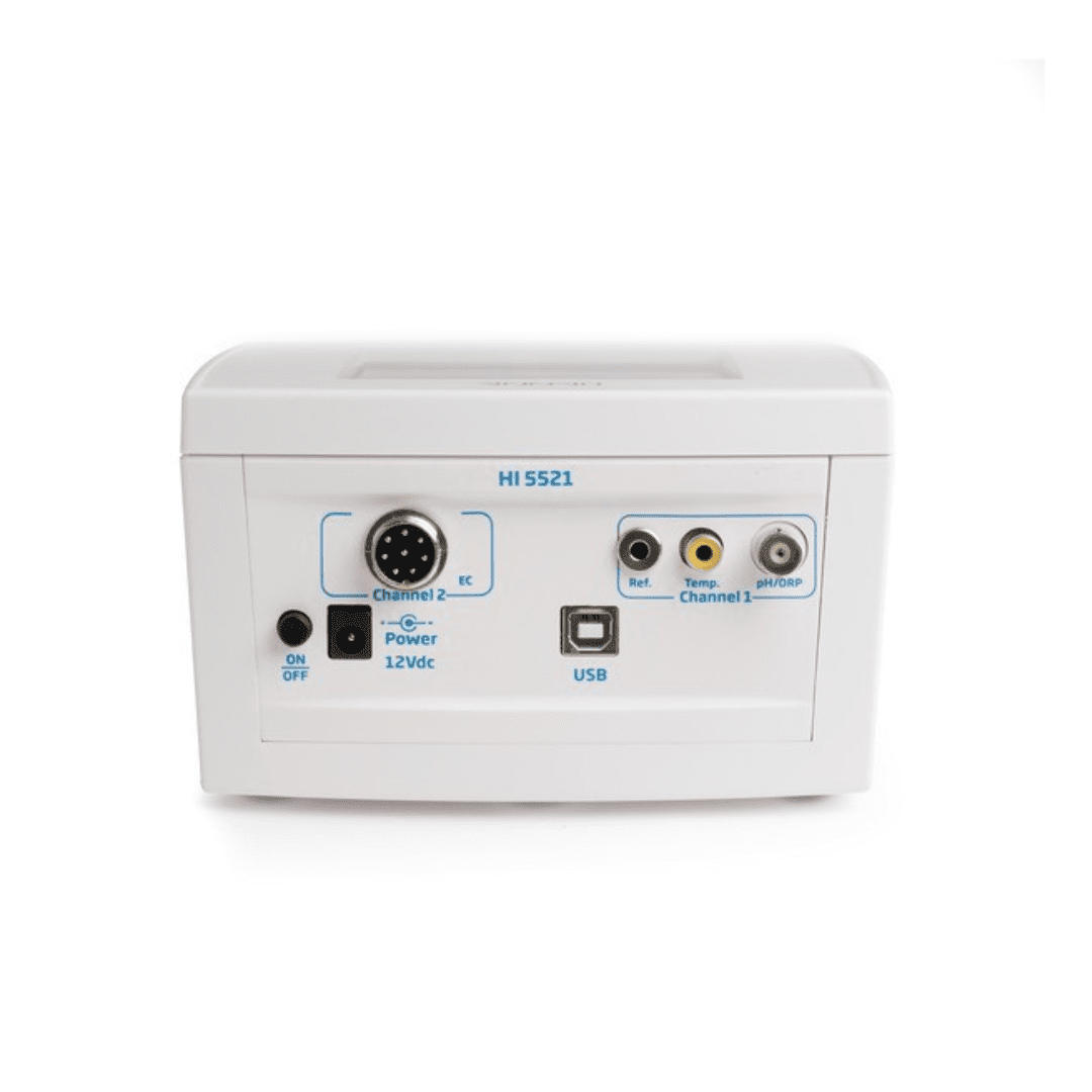 HI5521-02 est sont livré avec une électrode pH combinée HI1131B, une sonde EC/TDS HI76312, une sonde de température HI7662-W, des sachets de solutions tampons pH 4 et pH 7, des solutions de nettoyage pour électrodes (2 x 25 mL), une solution électrolyte (30 mL), une pipette, un support d’électrodes et un adaptateur secteur 12 V.