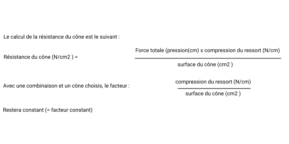 La résistance du cône est calculée en multipliant la force totale (pression en cm multipliée par la compression du ressort en N/cm) par la surface du cône en cm². La formule est : Résistance du cône (N/cm²) = Force totale / Surface du cône.