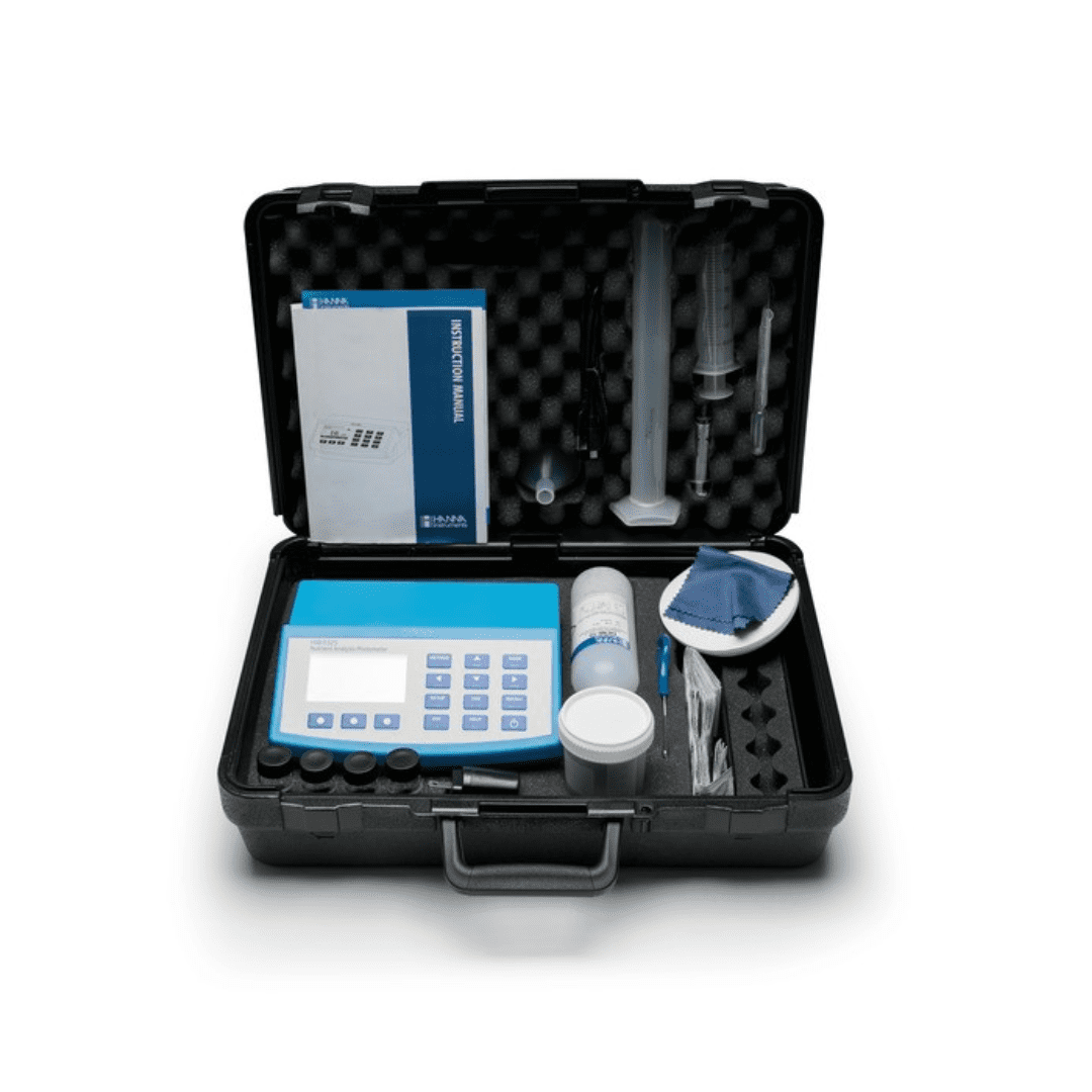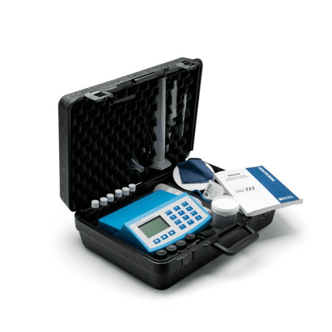 Le modèle HI83300-02 est fourni avec 4 cuvettes de mesure avec couvercle, un chiffon de nettoyage pour cuvettes, un connecteur USB-micro USB, un adaptateur de courant, et des instructions.