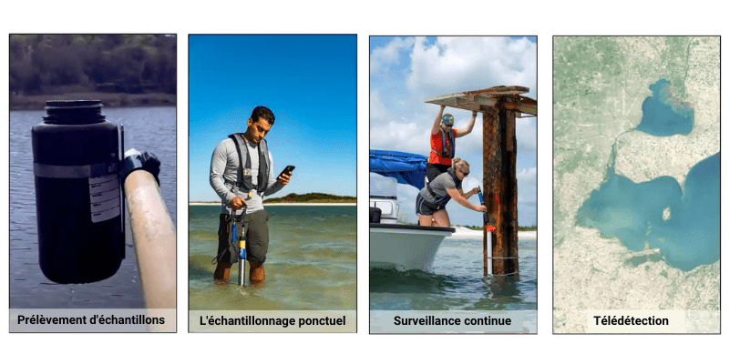 Dans le cadre de cet article, nous nous concentrerons sur l’échantillonnage ponctuel et la surveillance continue. Ces méthodes sont particulièrement adaptées aux projets visant à recueillir des données à haute précision sur la qualité de l’eau et la dynamique des efflorescences. L’échantillonnage ponctuel offre une grande flexibilité et de faibles coûts initiaux, ce qui en fait une option intéressante pour les projets dont le budget est limité ou qui nécessitent des données provenant de plusieurs endroits. D’autre part, la surveillance continue fournit un ensemble de données plus détaillé et plus complet, saisissant les changements temporels et permettant l’analyse des données en temps réel, ce qui peut être essentiel pour une prise de décision opportune et la gestion des efflorescences.